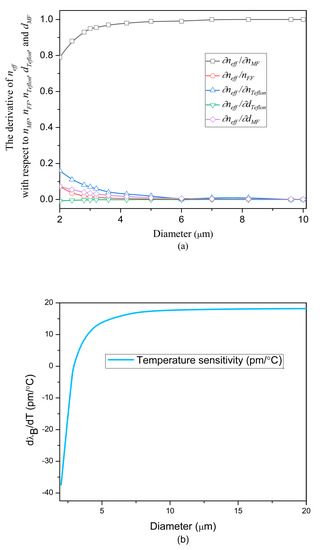 We calculate the value of , , , , for different MF diameters as shown in Figure 3a. As the MF diameter increases from 2 μm to 9 μm, the derivative of with respect to also increases until it approaches 1, whereas that the derivative of with respect to , , and decreases until it approaches 0. When MF-BG diameter is larger than 9 μm, the derivative of with respect to all of the above parameters are almost unchanged. In the whole process, the derivative of with respect to is approximately being zero. Thus, the thermal effect of the proposed sensor highly depends on the MF diameter when it is less than 9 μm. Substituting Equations (3) and (4) into Equation (2), the relationship between and the MF diameter can be achieved in Figure 3b. When the MF-BG diameter is 2 μm, the temperature sensitivity is −33.98 pm/°C. As the diameter increases to 2.8896 μm, the sensitivity to temperature changes almost linearly to −1 pm/°C. In the diameter range of 2.8896–2.997 μm, the reflected wavelength shift is within ±1 pm/°C. When MF-BG diameter increases from 2.997 μm to 8.4 μm, the temperature sensitivity rises to 17.3 pm/°C. After that, the MF-BG diameter affects the temperature sensitivity little. Consequently, the MF-BG-based magnetic field sensor can be made temperature-insensitive in an inherent manner.