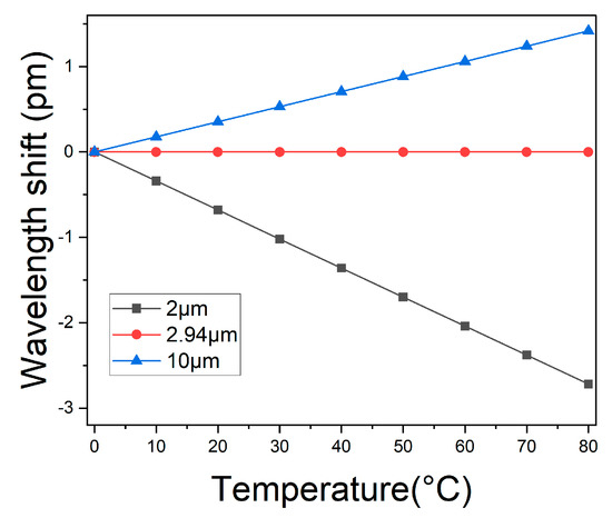Furthermore, the reflected spectrum shift of the sensor from 0 °C to 80 °C with different diameters is also calculated in Figure 4. Consistent with the above theoretical analysis, the temperature sensitivity of 10 µm MF-BG is 17.7 pm/°C, showing that the temperature sensitivity has been overbalanced. In contrast, the temperature sensitivity of 2 µm MF-BG is −33.98 pm/°C, which is the underbalanced grating. When MF-BG diameter is 2.94 µm, the central wavelength of the reflection spectrum changes little.