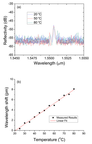 The reflected spectrum shift of the sensor at different ambient temperature is shown in Figure 6. As we can see from the figure, the Bragg wavelength λB shifts slightly as the temperature went up. When the temperature increased from 20 °C to 80 °C, the reflected wavelength shifted only 8 pm. In other words, the temperature response sensitivity of the Bragg wavelength is about 0.13 pm/°C when the MF-BG diameter is 2.94 μm in our experiment.