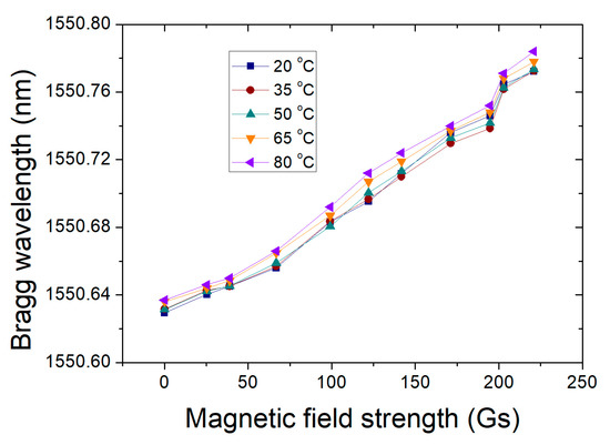Furthermore, we investigated the impact of the external magnetic field on the reflected spectra of the sensor when the environment temperature is 20 °C, as shown in Figure 7a. It indicates that the central wavelength of MF-BG reflected spectra shifts towards the longer wavelength with the increase in the external magnetic field. When the magnetic field is 0 Gs, 40 Gs, 99 Gs, 142 Gs, and 221 Gs, the corresponding Bragg wavelength is 1550.63 nm, 1550.66 nm, 1550.70 nm, 1550.73 nm, and 1550.78 nm, respectively. The linearity is more than 0.985, as shown in Figure 7b. In addition, the Bragg wavelength of the sensor versus the external magnetic field at different temperatures is observed in Figure 8. It is indicated that, under different temperatures, the response of the sensor to the applied magnetic field is almost consistent. It further verifies that the proposed magnetic field sensor can be made temperature-insensitive by adjusting the MF-BG diameter within an appropriate range. The reflected wavelength shifts almost linearly as the magnetic field increased 0 Gs to 221 Gs with the sensitivity of 0.667 pm/Gs. As a result, the temperature cross-sensitivity induced error in measurement can be calculated to be 0.2 Gs/°C.