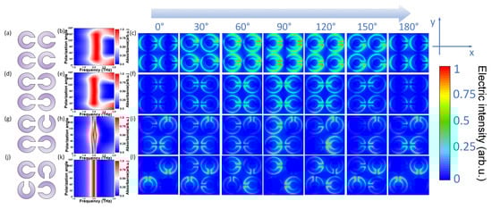 Next, we considered the design with axisymmetric opening directions and random opening directions, as shown in Figure 1d,g. As shown in Figure 1f,i, when α changed from 0° to 180°, the polarization angle of terahertz wave still had an effect on the electric field intensity of Y-axis component, and the induced current directions generated by these two structures could not offset each other, so they were still sensitive to the electric field direction of terahertz waves and had polarization selectivity. As shown in Figure 1e,h, the resonance absorption peaks between 1.0 and 3.0 THz were not stable, and they were not the stable structure that we required.