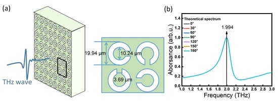 An SPR biosensor is usually composed of two layers of materials: (1) the base layer, which is usually composed of polyimide, silicon, quartz and other materials with good transmission capacity for THz waves, and (2) the metal layer, which is usually composed of gold, copper, and other electrode materials with good electrical conductivity [27,28,29,30]. The metal layer must be designed graphically and must be composed of a non-closed unit structure to allow for a capacitive inductance effect when the layer is excited by THz waves, generating an oscillating current and resulting in a characteristic resonance peak [31,32]. The properties of the THz resonance peak determine the sensitivity, accuracy and stability of the method. However, THz waves have polarization, and the opening direction of the cell structure determines the polarization selectivity of the SPR biosensor. Therefore, once the angle between the polarization directions of the SPR biosensor and THz wave changes, the SPR biosensor will exhibit a frequency shift in the THz resonance peak that introduces a large error component to the test results [33]. For this reason, researchers have attempted to locate the SPR biosensor using a mechanical device, but due to the existence of mechanical tolerance, the SPR biosensor position cannot remain accurate and consistent, so this interference cannot be completely eliminated.