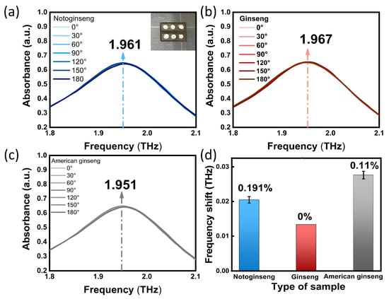 We added of 30 µg notoginseng, ginseng and American ginseng to the biosensor, respectively. Then, we adjusted the angle between the polarization direction of the SPR biosensor and the THz wave to 0°, 30°, 60°, 90°, 120°, 150°and 180°for the test. Here, the polarization angle of the THz wave was set as 0°when the biosensor was parallel to the X-axis. As shown in Figure 4a–c, regardless of how the polarization angle of the THz wave was deflected, the measured THz resonance absorption peak of the SPR biosensor of notoginseng, ginseng and American ginseng were always located at 1.961, 1.967 and 1.951 THz, and the intensity was stable. As can be seen from Figure 4d, the fluctuation range of polarization frequency shift of notoginseng, ginseng and American ginseng caused by angle change was 0.191%, 0% and 0.11%, respectively. The experimental results show that the SPR biosensor covered with samples still showed a good polarization-independent performance, which can ensure the test efficiency of the sample.
