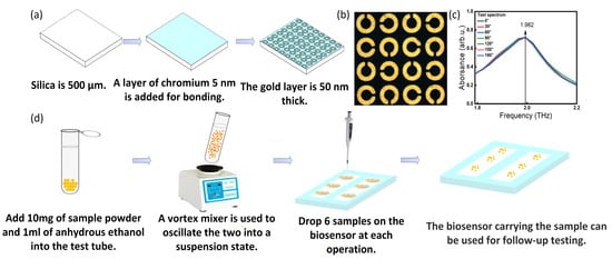 According to the parameters designed in Section 2.1, the biosensor was processed, as shown in Figure 4a. Figure 4b shows a microscope image of the structure of the SPR biosensor. We also tested its polarization-independent performance, as shown in Figure 4c. It was found that the resonance absorption peak measured by the SPR biosensor remained at 1.982 THz, and the intensity was stable, showing a very high polarization independence. The difference between the experimental (1.982 THz) and theoretical peak value (1.994 THz) may be that in the theoretical calculation, we changed the Au/Cr layer into a perfect electrical conductor to improve the calculation efficiency, and the difference in the dielectric constant of the material leads to the deviation of the physical characteristic peak. Therefore, the structural design of this biosensor greatly improved the stability of the test.