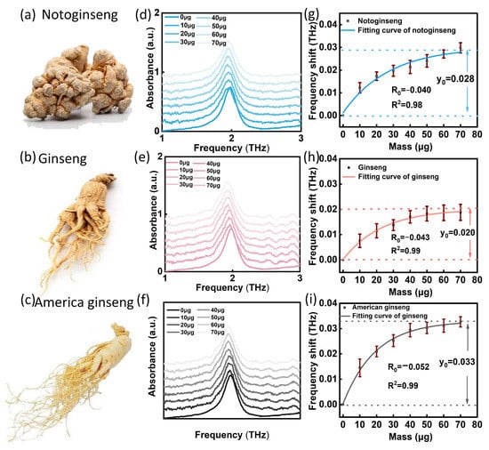 After the simulation analysis confirmed the feasibility of the THz SPR biosensor for identification of samples with different dielectric constants, we selected notoginseng, ginseng and American ginseng as samples for testing and identification. Here, we fixed the sample volume of each drop on the biosensor surface for testing. Figure 6a–c shows the sample images of notoginseng, ginseng and American ginseng. As the volume of the sample dropped on the biosensor surface increased, the mass of the samples contained in the suspension increased gradually from 10 µg to 70 µg. With the superposition of sample, the resonant peak of SPR biosensor moved to a low frequency, as shown in Figure 6d–f. Through nonlinear fitting of the relation between the frequency shift and mass (Figure 6g–i), the respective fitting equations of notoginseng, ginseng and American ginseng can be obtained: