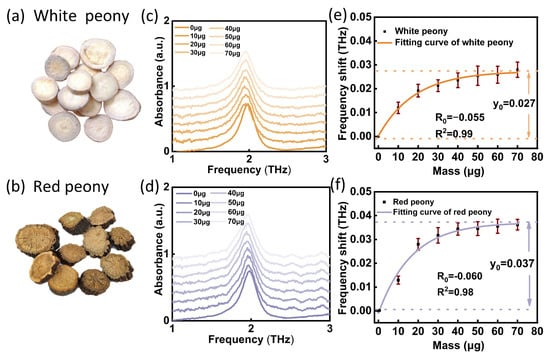 Experimental results of THz SPR biosensor for white peony and red peony. (a,b) Sample images. (c,d) Test results of white peony and red peony on THz SPR biosensor. (e,f) Corresponding frequency shift of mass function of white peony and red peony. Each data set is marked with a standard deviation.