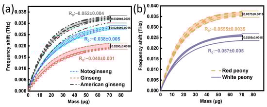 As shown in Figure 7e–f, the fitting equations of the two medicines obtained by the experiment are consistent with the simulated Equation (1) with independent coefficients. The measurement coefficients (R2) of the fitting equations were all greater than 0.98, and the standard deviation (SD) ranges of white peony and red peony were 0.168–0.325% and 0.237–0.403%, respectively. It was found that different species of Paeonia showed different maximum frequency shift y0 and saturating speed R0, which is also consistent with the theoretical simulation results. In Table 2, we list the different parameters corresponding to the formula. The fitting parameters of white peony and red peony were also different, and the error range did not overlap. Therefore, the detection method based on the SPR biosensor can realize the identification of Panax species and can also be applied to the identification of other kinds of medicines. Compared with the traditional method, this method has the advantages of simple operation, less time consumption and less sample consumption.