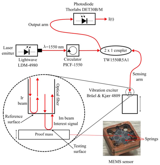 Optical setup showing the components of the Michelson interferometer, the vibration exciter, and the proof-mass MEMS [27].