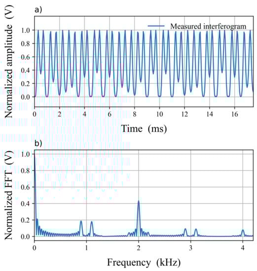 Figure 2 shows a measured amplitude of the interferometric signal and its spectrum. The signal is obtained with the optical setup of Figure 1 for the modulated and carrier signals of 100 Hz and 1000 Hz, respectively. The amplitude was normalized to a maximum amplitude of 1 V. The signal is very similar to the form of Equation (1) for a sinusoidal displacement. It can be recognized that the information of interest is inside the cosine argument of Equation (1), and the procedure to extract the information from is known as demodulation.