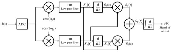 Block diagram of the homodyne interferometric demodulation scheme, Equations (4) to (11), as implemented on the FPGA.