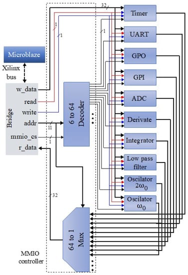 The entire implementation of the embedded system hardware uses a very high-speed integrated circuit (VHSIC) hardware description language (VHDL) with Vivado®® Design Suite 2019.2. The organization of hardware modules is based on the memory-mapped inputs/outputs (MMIO) method [30]. The Xilinx MicroBlaze soft-core microcontroller uses the same address space to address both memory and I/O cores. The MMIO controller decodes an input signal to select and enable one of the hardware modules (slots) and can accommodate up to 64 instantiated cores. After being wrapped with an interface circuit, custom digital modules (oscillators, derivative, integral, etc.) can be plugged into the platform [31].