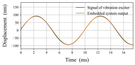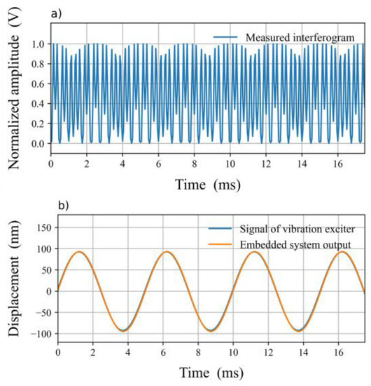 Figure 7 shows the input and output signals of the embedded system for a modulated signal of 200 Hz. Figure 7a shows the input interferogram . In addition, a comparison between the output signal and the modulated signal is shown in Figure 7b. To change the units from radians to meters, both signals are scaled to .