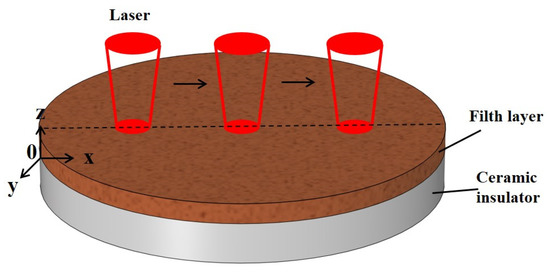 According to international standards, the insulator can withstand the maximum local temperature range of 150–250 °C. This study takes the fouled porcelain insulator piece as the research object [23]. As shown in Figure 2, a porcelain insulator model is established with a radius of 0.5 mm and a thickness of 0.1 mm, and the fouled layer on the model surface is 0.05 mm thick at the bottom. The pulsed laser parameters are as follows. The maximum laser power is 100 W, the wavelength is 1064 nm, the spot radius is 0.1 mm, the laser repetition frequency is 25,000 Hz, the pulse duration is 200 ns, and the laser works along the insulator sheet x-axis direction scanning back and forth.