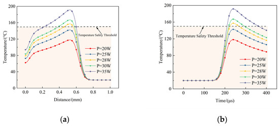 The laser scanning speed is 2500 mm/s, and the laser power is 20 W, 25 W, 28 W, 30 W, and 35 W. Figure 3a shows the distribution of the radial X-axis temperature variation on the surface of the porcelain insulator with different laser powers at t = 250 μs. The maximum insulator surface temperatures were 117.98 °C, 142.47 °C, 157.17 °C, 166.97 °C, and 191.46 °C for the five different power cases. As the porcelain insulator dissipates heat, the temperature of the scanned area will gradually drop after reaching the peak. At this time, the temperature of the x = 0 position and the center point temperature have a significant temperature difference. At the same time, when the laser power is 20 W and 25 W, the maximum temperature does not exceed the safety range of the porcelain insulator temperature. In contrast, when the laser power reaches 35 W, the maximum temperature exceeds the safety range and will cause damage to the porcelain insulator. To ensure the safe operation of laser cleaning, the power is set at approximately 25 W.