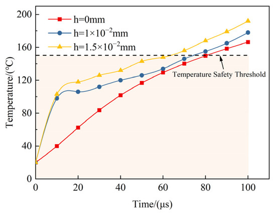 Figure 5 shows the temperature distribution of the water film working condition at different heights. When the water content is within a certain range, the temperature increases with the increase in water content during the cleaning process. In the initial stage of cleaning, there is a substantial increase in temperature because the thermal conductivity of the material containing moisture will be greater than that of the dry material, and the higher the moisture content, the greater the thermal conductivity. After 10 μs, the temperature and time are linear and on the rise, and after 100 μs, scanning is completed; the highest temperature reaches 166.34 °C, 178 °C, and 192 °C, respectively, in the three working conditions. In the laser cleaning process, laser wet cleaning can quickly enhance the cleaning temperature, and in a certain range of water content, the more water content, the more obvious the temperature rise. As can be seen from Figure 5, laser wet cleaning produces a higher temperature rise and more efficient cleaning than dry cleaning (h = 0 mm). The right amount of moisture can promote laser wet cleaning, but too much may lead to too fast a temperature rise and damage to the insulator surface; the degree of dryness and wetness of the dirt in the laser cleaning process should not be neglected.