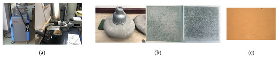 The experimental equipment included a pulsed fiber laser with a wavelength of 1064 nm, a pulse width of 200 ns, and a repetition frequency of 25,000 Hz; computer control system; collimated beam expander; scanning oscillator; and vent. The structure of the laser cleaning device is shown in Figure 6a. The experimental material is porcelain insulator alumina ceramic tile (100 mm × 100 mm × 5 mm). The fouling layer is coated with 1 mg/cm2 of gray density. The experimental samples are shown in Figure 6b. The sample laser before irradiation under the microscope is shown in the Figure 6c. During the experiment, a Ti480Pro infrared camera was used to measure the temperature change process on the surface of the porcelain tiles and the metallographic microscope was used to observe the microscopic surface soiling of the porcelain tiles.