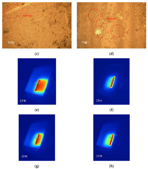 Cleaning effect and Infrared temperature distribution with different powers: (a) 25 W; (b) 28 W; (c) 30 W; (d) 35 W; (e) 25 W; (f) 28 W; (g) 30 W; (h) 35 W.