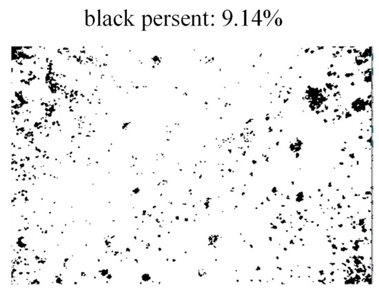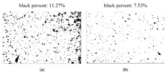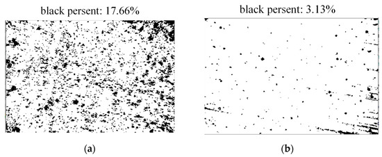 Figure 10a–d displays a metallographic microscope image showing the cleaning effect of different scanning speeds. Figure 10e–h shows the infrared temperature distribution at different scanning speeds. From Figure 10a,e, it can be seen that when the scanning speed is 1000 mm/s, the maximum temperature of the porcelain tile reaches 196.6 °C and is significantly damaged by the laser. From Figure 10c,g, it can be seen that when the scanning speed is 2000 mm/s, the surface is the cleanest, the highest temperature is within the safe range, and the cleaning efficiency is the highest. Compared with the simulation results, the actual experimental environmental conditions are not as ideal as the simulation conditions. Nevertheless, the difference in temperature values is minimal and consistent with the simulation results. The binarized images at different scanning speeds are shown in Figure 11. Figure 11a shows that when the scanning speed is 2500 mm/s, the black rate of dirt is 17.66%, which indicates the cleaning efficiency is 82.34%. Figure 11b shows that when the scanning speed is 2000 mm/s, the black rate of dirt is 3.13%, which indicates the cleaning efficiency is 96.87%.