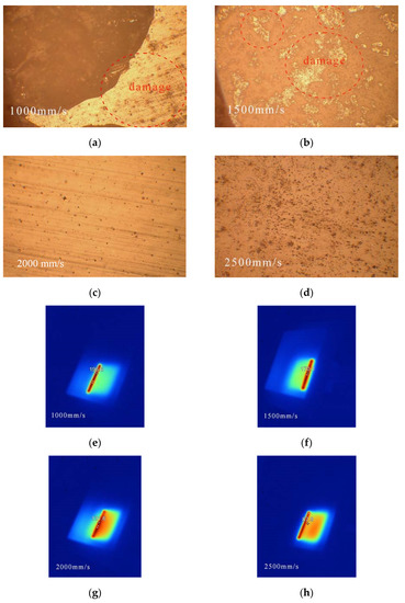 Cleaning effect and Infrared temperature distribution with different scanning speeds: (a) 1000 mm/s; (b) 1500 mm/s; (c) 2000 mm/s; (d) 2500 mm/s; (e) 1000 mm/s; (f) 1500 mm/s; (g) 2000 mm/s; (h) 2500 mm/s.