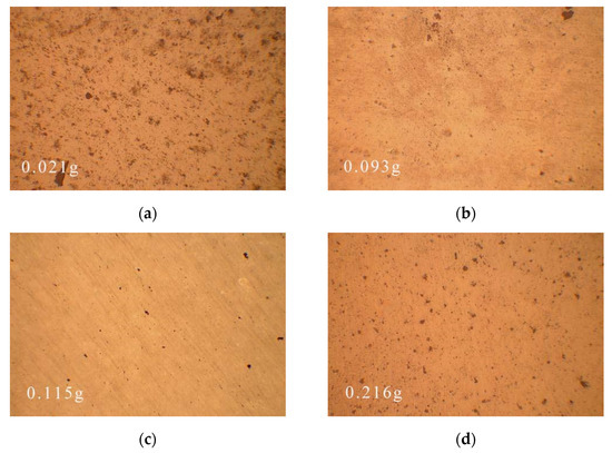 Cleaning effect of samples with different water contents observed by a metallographic microscope: (a) 0.021 g; (b) 0.093 g; (c) 0.115 g; (d) 0.216 g.