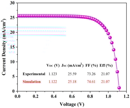 Among various layers included in a solar cell device, HTL plays an essential role in solar cell performance via two main pathways [47]: (I) it facilitates the transport of photogenerated holes to the counter electrode; (II) HTL prevents the direct interaction between the active layer and the electrode. As mentioned before, despite the extensive integration of Spiro-OMeTAD into solar cells to enhance PCE, the low cost-effectiveness, low hole mobility, and server instability under certain conditions have limited their applications. Therefore, different types of HTLs have been examined. To begin the simulation, a solar cell model of FTO/SnO2 (90 nm)/FAPbI3 (550 nm)/Spiro-OMeTAD (200 nm)/Au was simulated based on an experimental setup to ensure the accuracy of the results [48]. SnO2 was chosen as ETL due to its high stability, mobility, transmittance, energy alignment with perovskite, and facile processing [49]. As is shown in Figure 2, the obtained curve and parameters from simulations are well-fitted with the experimental results, attesting to the reliability of our numerical simulations.