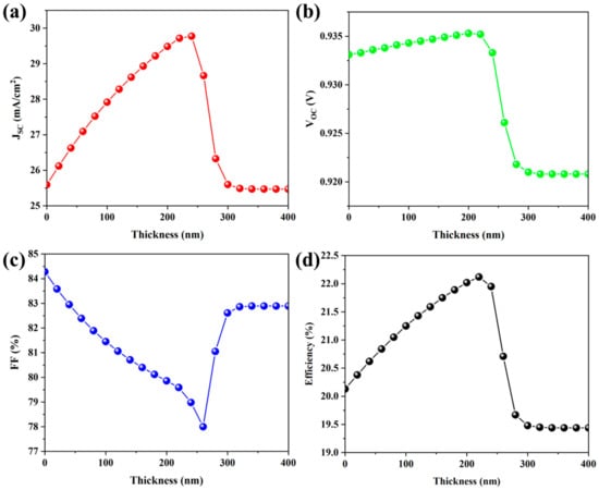 Figure 4a,b show the effect of CsSnI3 thickness on the JSC and VOC of the perovskite solar cells. The results indicate that JSC and VOC are improved with an increased CsSnI3 thickness up to 220 nm. According to experimental surveys [59], thickening the HTL gives rise to smoother film surfaces with reduced interfacial recombination that ultimately improves VOC. In addition, a thicker HTL reduces the roughness of the Au layer with enhanced light reflectivity, boosting carrier generation and, thus, the current density [59,60]. Since, in our simulations practice, roughness is considered independent and constant, we sought other reasons for this observation. First, the capacity of a thinner HTL is not sufficient to accumulate whole holes. The small number of accumulated holes also pushes a backward force to incoming holes and decreases the effective carriers. Second, the depletion region between the perovskite layer and a thin HTL is not as powerful as thicker ones, which fails to provide a strong driving force for the separation of carriers. The results have also indicated that when the thickness of HTL is higher than 220 nm, VOC and JSC are prone to diminish. This is mainly because the traveling distance of the carriers to arrive at the interface increases. As a result, traps encourage non-radiative Shockley–Read–Hall recombination and the augmented trap-assisted recombination rate [61]. The effect of HTL thickness on FF is shown in Figure 4c. The first downward trend is a consequence of an increase in series resistance and charge career transport time. By reaching the HTL thickness of around 260 nm, the layer fully covers the perovskite film, raising the shunt resistance with improved FF [59,60]. The variation in PCE with the HTL thickness indicates an optimum CsSnI3 thickness of 220 nm, which yields PCE = 22.12% (Figure 4d).