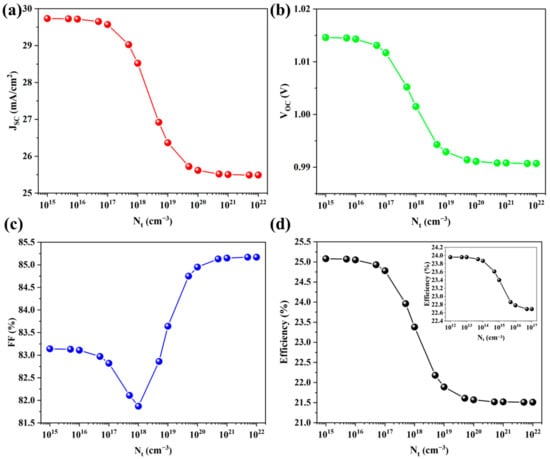 In addition to the doping density, HTL defect density (Nt) influences the performance of perovskite solar cells. Figure 6 shows this effect on the characteristics of the investigated cells. In the range of 1015 to 1017 cm−1, no major changes in the characteristic parameters, including VOC, JSC, and PCE, are noticed (Figure 6a,b,d). However, a sharp decline in VOC and JSC is seen at higher Nt values. This change is mainly attributed to the instant generation of abundant recombination sites in the HTL and interfaces [67]. A higher HTL defect density induced by different sources, such as unwanted foreign atoms, native defects, and dislocations, creates shallow or deep traps. Therefore, as non-radiative recombination centers, the traps are harmful to cell performance. The inset of Figure 6d demonstrates that with increasing the number of interface defects, a lower efficiency is attained. These defects, which mostly stem from the lattice mismatch between AL and HTL and/or iodide or MA migration, form deep traps at the interface and act as Shockley–Read–Hall (SRH) recombination centers. However, in the case of CsSnI3 and FAPbI3, the similarity of the lattice constants declines the probability of interface defects generation [40,61]. As a result, PCE declined to about 21.5% at Nt = 1021 cm−3. Similarly, the initial downward trend of FF is owed to the high number of recombination centers and the amount of series resistance caused by the significant number of traps (Figure 6c). When Nt exceeds 1018, an upward trend is observed. This behavior can be attributed to the tunneling effect, which happens when Nt substantially rises, i.e., traps are as close together as to prefer to adopt the tunneling method of transport [68]. Notwithstanding the better results in lower defect density, the simulation results deviate from the experiments; hence, 5 × 1017 was selected.