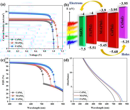 (a) J-V curves of the planar solar cells made of different perovskites as AL. (b) Energy level diagram of FAPbI3, MAPbI3, and CsPbI3. (c) EQE and (d) absorption diagrams of solar cells with different types of perovskite layers, respectively.