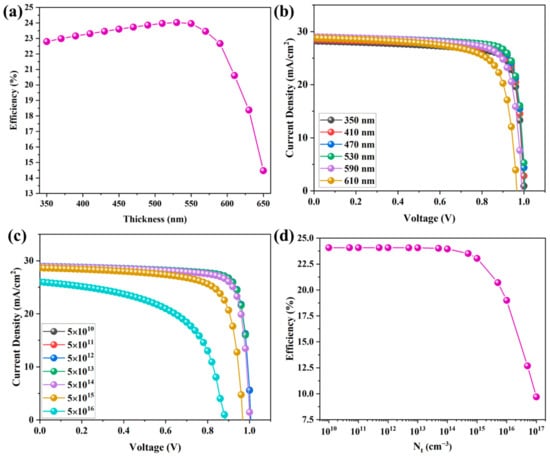 (a) Efficiency of solar cells versus thickness of the active layer. (b) J-V characteristics of solar cells depending on the FAPbI3 thicknesses. Effects of defect density on the (c) J-V response and (d) efficiency of the perovskite solar cells.