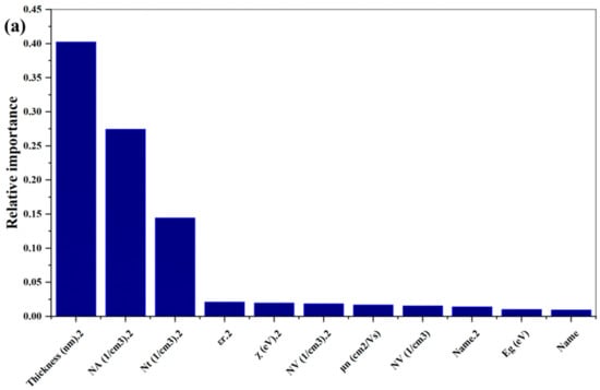 In the present work, the Random Forest algorithm was employed for the training and testing phases because of its robustness against overfitting and optimum complexity [45]. It is worth noting that more powerful contenders, such as neural networks and deep neural networks, introduce unnecessary complexity. We believe that the added complexity will cause overfitting and eventually lead to poor performance [71,72]. “Kolmogorov Complexity” is a concept that denotes when the complexity and cardinality of the data are greater than the model’s ability to comprehend, even large amounts of data may not increase the model’s accuracy. In our case, the size of the dataset was too small, and the complexity of the data definitely demanded more records to be added. Previous studies have indicated that reducing the complexity of the dataset can potentially improve the accuracy of the model [73,74]. Considering the low number and high complexity and cardinality of the data points, focusing on reducing this complexity can lead to far better results. By employing Scikit learn, we could observe the effect of every single feature in the overall predictive performance of the ML model. The relative importance of the 11 features with the highest importance is shown in Figure 9a. The common features between perovskite and HTL layers are indexed in the respective order; index 2 denotes an attribute of the HTL layer. The results reveal that thickness, Nt, and NA of HTL are the most responsible features that dictate the difference in the performance of two distinct solar cells. This valuable information can optimize the workflow and individual steps toward designing new solar cells. Therefore, these features were selected to build a new model with approximately identical performance but a noticeably less size due to the difference in feature number. Model predictions were calculated and plotted for each target value, as shown in Figure 9b–e. The plots must have a slope as close to 1 as possible. The prediction of the ML model determines a mean accuracy of 75% with a mean R2 of 0.78 between actual and predicted values per target feature. Although the accuracy is not high, this achievement would serve as a commendable gateway toward further investigations and a much-needed bridge between the fields of artificial intelligence and materials science. Undoubtedly, a fully trained model constructed on a wide range of input data (trained values) would result in more accurate and realistic outcomes.