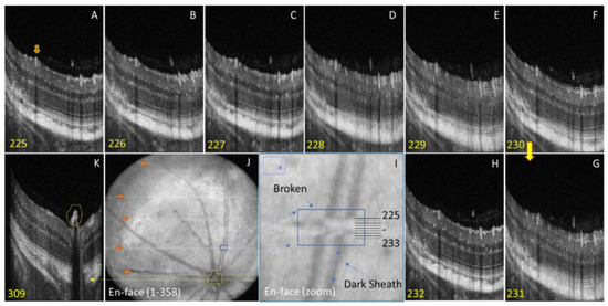 A close comparison of Figure 2A,H, with Figure 2B,H shows overlapped and unsharp/hazy retinal layers. The corresponding enface is shown in Figure 2J and its digital zoom section (in Figure 2I) shows the overall effect. The orange-colored horizontal arrow-shaped markers are used to highlight the existence of horizontal regions giving entirely the wrong output. Figure 2I highlights the fact that because of movement, the blood vessel is wrongly depicted as broken (between 225 and 233).