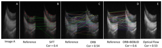 Output of algorithms for image registration. (A) Sample image A is the image that needs registration, (B–D) shows the keypoints obtained from mapping between the reference image and sample image (after registration) obtained by SIFT, ORB, and a combination of ORB and BEBILD, respectively. (E) shows the registered image using optical flow. The correlation value remained below 0.6 for all.