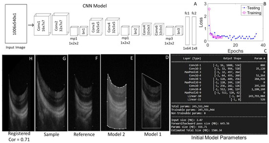 Registration using deep CNN: (A) in-house developed CNN model architecture, (B) loss values vs. epochs, (C) initial model parameter details, (D,E) annotation models, (F–H) are, sample, and registered images.