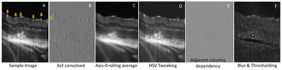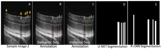 The shadows shown in Figure 2 can be considered less-bright vertical columns, with the requirement that the information needs to be preserved within. The case is shown in Figure 2K; however, we also expect to generate the missing information. In some cases, this may be accomplished by just conveniently extending the retinal layer maps from both sides using interpolation. The details of classical approaches, such as smearing, balancing HSV values, convolving filters, etc., are tested and directly discussed in the results section. The detection of the shadow is considered a segmentation problem. Standard U-Net and RCNN were tested [31,32].