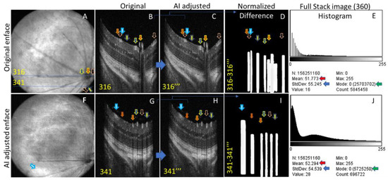 The correlation value between data with and without registration for this data set was 0.703. Once the location of shadows was found, the next step required changing the brightness/pixel gray values. Equation (2) was used to manipulate the pixel value under the shadow only. Sensitivity analysis (a simple brute-force approach) was performed to find the optimized (visual perception was used) value of α = 1.3. The final shadow removed registered (A.I.-adjusted) images, and the respective original images are shown in Figure 7. Figure 7A,B,G show the enface and B scans (index 316 and index 341) of the original data (stack of 360 B scans) and Figure 7C,F,H show the corresponding A.I.-segmented pixel-value-adjusted images for shadow suppression. The effect is visible by comparing Figure 7B with Figure 7C,G and Figure 7H. The shadows, however, were not entirely removed but suppressed. The corresponding normalized differences (with the corresponding shadow locations) are also shown in Figure 7D,I as basically equivalent to the mask created by A.I. to segment these locations. Figure 7B,E show that the chosen value of alpha was able to suppress the existence of relatively thin shadows (highlighted with arrow markers with light blue boundaries and white inner cores) only. The biggest possible dark region right below the optical cord was adjusted as well; however, interpolation to the missing retinal layer maps is not included in this work. The difference between Figure 7B,C is shown in Figure 7D, which depicts the overall changes made by A.I. in this B scan. The major effect of suppressing the shadow was observed in the enface of the full stack of the 360 B scan. The enface of the original images (Figure 7A) suffered the case 2 registration issue and showed dark ILM vessels prominently. The AI-adjusted enface, however, had only a few jitters and dark vessels after post-processing. The histogram data obtained for the respective full stack are shown in Figure 7E,J. The difference in the mean pixel value of shadow-adjusted data increased (1%) from 51.77 to 52.29, and the standard deviation decreased (1.29%) from 55.25 to 54.54. The number of zeros (mode value) decreased (77%) from to . This is reflected in the increased smoothness of the histogram curve. The data set using several values of α was found to have poor performance as far as loss in standard deviation, zero-valued pixels, and increment in mean pixel value are concerned. The positive mean pixel values, negative standard deviation, and the number of zeros can be used as optimization factors to estimate the optimal α rather than using brute-force sensitivity analysis.