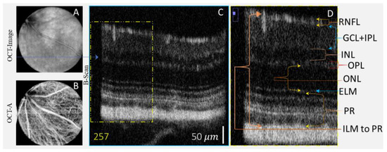 AI-based automatic retinal layer thickness estimation of BalBc female mice; (A,B) enface OCT and phase variance images, (C) the B scan with 257 indices (marked in the OCT image with a blue line), and (D) the zoomed section from an earlier image with the retinal layers/sections segmented.