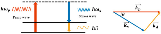 where , , and are the corresponding wave vectors of the acoustic phonon, incident photon, and scattered photon. The process is shown in Figure 3.
