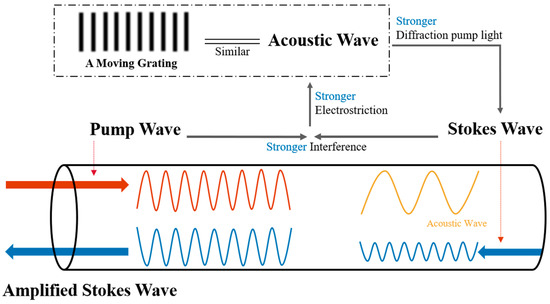 When the intensity of the narrow bandwidth light (typically in the fundamental mode) in optical fibers becomes large, SBS could be observed experimentally. The interaction picture could be illustrated in Figure 4. When light (pump wave) is incident on the optical fiber, the backscattered Stokes light (initially from spontaneous Brillouin scattering) interferes with the input pump light and generates an acoustic wave through the effect of electrostriction. The forward propagating acoustic wave acts as a Bragg grating, which scatters even more light in the backward direction. At a steady state, the strength of SBS is nonlinearly dependent on the input power.