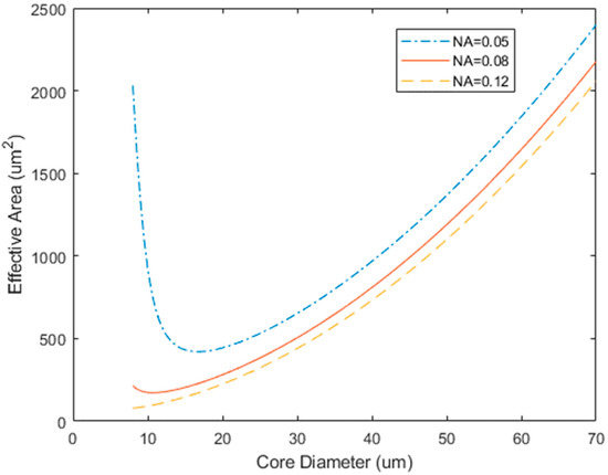 One viable technique is to design the optical fibers that have a large mode area (LMA) [73]. From Equation (9), a large effective area has a linear relationship with the SBS threshold. One way to increase the mode effective area is to lower the core refractive index and increase the core diameter. Figure 7 shows the relationship between the core diameter and mode effective area for the GeO2-doped step-index fiber with different numerical aperture (NA). The mode effective area increases when the core diameter exceeds a certain value. Below that value, the core diameter is not large enough to confine the electric mode. However, this method has constraint. The first constraint is that the optical fiber need be single mode. That means, when core diameter increases, the index difference must be decreased. However, the control of the small index steps in the glass manufacturing process can be difficult, which puts a limit to that method. The state-of-the-art conventional large-mode-area (LMA) fibers are generally limited in practice to diameters that are less than [74].