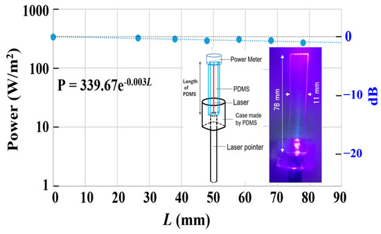 We designed a series of waveguides to investigate the optical loss of the PDMS with respect to the incident light. As shown in the inset of Figure 2, we made a case that holds the laser pointer firmly for the reproducibility of the experiment. The pointer-holding case is also made of PDMS, which is not as soft due to its large size. The case holds both the PDMS waveguide and the laser pointer closely to each other. Thus, the emitter port of the laser pointer placed in the case is in tight contact with the face of the PDMS waveguide, while the other end of the strip PDMS is placed firmly against an optical power meter. The laser beam power, shown in Figure 2, is measured at the end of the PDMS waveguide as a function of its length, L, using a long waveguide with an initial length of ~80 mm. Then, we cut the PDMS waveguide by ~10 mm each time and measured the power of the guided light. We repeated this process several times with the light source side untouched so that the possible air gap between the laser and PDMS waveguide could be minimized and remain constant throughout the course of the experiment. Note that the coupling of the LD to WG or even the presence of a finite air gap does not affect the slope of the plot in Figure 2; thus, the estimation of a is unaffected, as long as the coupling or the air gap remains constant for each waveguide with different L.