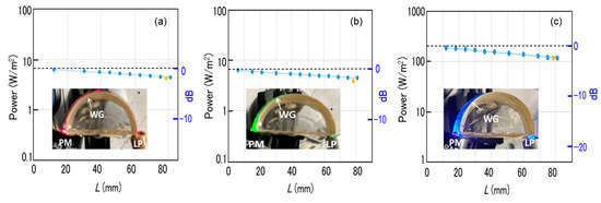 After testing samples provided by a company, we performed experiments using our handmade PDMS waveguides. The specifications of the planar PDMS waveguide were 3.5 mm × 11 mm × 78 mm. Since the sunlight went along the circumference in Figure 1c, the length of 78 mm was on the same order of circumference as a lamp post with a diameter of 50 mm. The ratio of PDMS raw material and curing agent was 10 to 1. The blue/violet laser pointer had a wavelength λ of 405 nm. As can be seen from Figure 2, the power of the blue laser beam itself at L = 0 was about 340 W/m2. The beam power decreased with L; the power at L = 78 mm was 268 W/m2. From the L dependence, we could get the optical loss coefficient α = 3/m for the blue/violet laser beam with λ = 405 nm. The loss of light through the PDMS waveguide was low enough for usage as a 2DPRCS waveguide around a lamppost cylinder with a diameter of 50–60 mm.