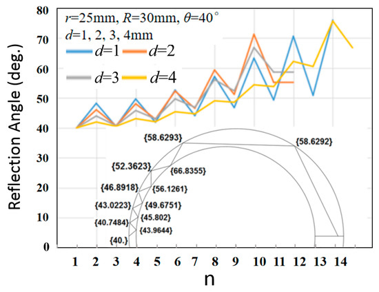 Reflection number dependence of the reflection angle obtained by software programming simulation for light incident on the nonconcentric cross-section waveguide. Here, θ1, θ2, θ3, and θ4 are the corresponding changes in angle for d = 1, 2, 3, and 4, respectively. n is the number of reflections that occur in the nonconcentric waveguide. The bottom inset shows the angle, in degrees, of each reflection during light propagation in the waveguide, with r = 25, R = 30, d = 3, and θ = 40°.
