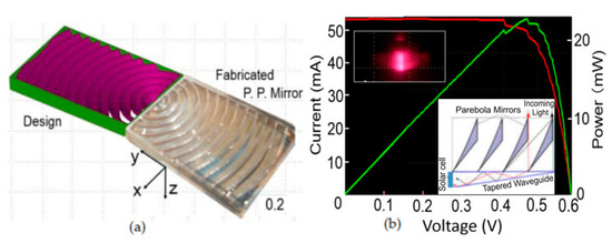 (a) Periodic parabola mirrors (PPMs): (left) design, and (right) fabricated PPM; (b) 2DPRCS demonstration using planar tapered waveguide (WG) and concentric periodic parabola mirrors (bottom inset), i.e., the I–V characteristics of a Si solar cell set at the edge of the planar tapered WG, and the concentrated light field at the edge of the planar tapered WG (top inset).