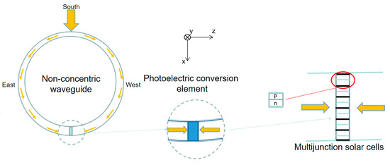 (Left) Cylindrical 2DPRCS photovoltaic system with nonconcentric cross-section waveguide and multijunction solar cells (shown in Figure 8a). (Middle) Enlarged view of the photo-electric conversion element. (Right) Cross-section of the photoelectric conversion element. The yellow arrow shows the propagation of sunlight. For the photoelectric conversion element composed of multijunction solar cells, sunlight coming through counterclockwise and clockwise routes, as well as sunlight from the east, south, and west sides, can be utilized.