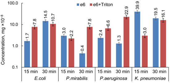 Analysis of the intracellular concentration of the photosensitizer was carried out on strains of E. coli, K. pneumoniae, P. aeruginosa and P. mirabilis. Bacteria were incubated with 50 μg of Fotoditazin for either 15 or 30 min in the dark at room temperature. In addition, Triton X-100 at 10% vol was added to some of the samples. It was found that Triton X-100 increased the intracellular concentration of the photosensitizer over time (Figure 3). At the same time, Triton X-100 free samples demonstrated a decrease in the intracellular concentration of the photosensitizer after 30 min. It should be noted that the intracellular concentration of Fotoditazin after 15 min incubation of the species treated with Triton X-100 differed by less than 3.5 times.