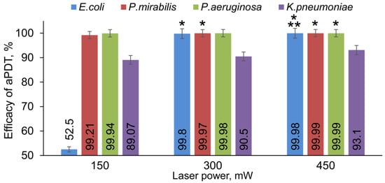 The influence of output laser power on the efficacy of aPDT of Gram-negative bacteria. Bacteria were incubated with Fotoditazin and Triton X-100 for 15 min at room temperature in the dark, and illuminated by continuous wave laser at different output powers. Statistically significant differences compared to the corresponding species irradiated by 150 mW (*) and 300 mW (***) are marked.