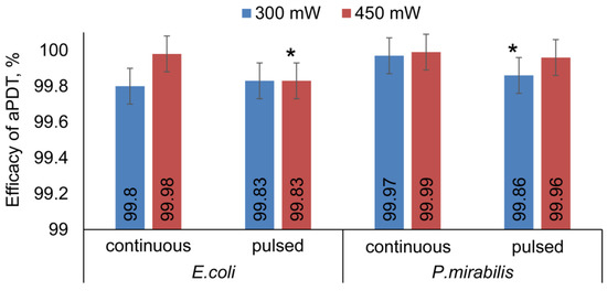 For comparison of the aPDT efficacy under the pulsed and continuous mode of irradiation, we chose the output power of 300 mW and 450 mW. The bacteria were incubated with a photosensitizer and Triton X-100, and were not washed after that. E. coli and P. mirabilis were irradiated by a pulsed laser that had the values of output power and power density similar to the continuous mode (Figure 5). It was found that, at 300 mW, the efficacy of aPDT against E. coli was comparable for the pulsed and continuous mode irradiation. The increase of the pulsed laser output power did not affect the aPDT efficacy against E.coli. However, it was reduced in comparison with the continuous mode irradiation at 450 mW. The irradiation of P. mirabilis by a pulsed laser at 300 mW output power led to a reduced aPDT efficacy, compared to the continuous mode irradiation at the same power. The aPDT efficacy after irradiation at 450 mW by pulsed laser increased in comparison with irradiation at 300 mW. However, it was lower than after the continuous mode irradiation at the same power.