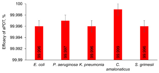 The aPDT efficacy values were presented as a mean ± standard deviation. To calculate the statistical significance of the differences, the ANOVA with Bonferroni post hoc test was used. Statistical analysis was performed with Statistica 10 (StatSoft. Inc., Tusla, OK, USA). p-values ≤ 0.05 were considered statistically significant.