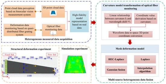 The structural deformation in the product assembly process has a great impact on the subsequent assembly accuracy control and overall assembly quality of the product. To obtain the structural deformation in the product assembly process quickly, efficiently, and accurately, a 3D mapping technology for structural deformation is proposed. The overall scheme is shown in Figure 1. The specific implementation steps are described as follows. First, we obtained 3D point-cloud and optical fiber monitoring waveform data based on a binocular vision measurement system and quasi-distributed fiber grating monitoring system to establish a high-fidelity model based on measured data. Because the data sources were significantly different and the data structure was of unequal valence, the measured data in the model were characterized by “multi-source heterogeneity.” Second, according to the waveform data obtained from optical fiber monitoring, the conversion relationship between the waveform data and spatial 3D point coordinate data was deduced by using the tangent recurrence method. Third, we established a mesh deformation model based on point-cloud optimization, and compared the deformation effects of four mesh deformation models based on the unequal curvature surface to verify the feasibility and accuracy of HEC-Laplace. Lastly, the feasibility of 3D mapping technology was verified through comparison and structural deformation experiments, which could provide a theoretical basis for precision control in the product assembly process and improve the overall assembly quality of products.