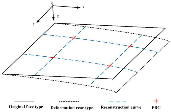 Here, an FBG sensor was used to monitor the deformation of complex surfaces [16]. When light with a certain width and frequency was incident on the FBG fiber channel and passed through the grating area, the light wave with a frequency near the grating would be reflected back, whereas the light wave with other frequencies would pass through the FBG sensor. The resonance equation of FBG is expressed as